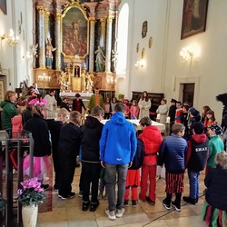 Die Zusammenarbeit mit der Pfarre zeichnet sich vor allem durch den regelmäßigen und sehr guten Kontakt mit unserem Herrn Pfarrer Alois Schlemmer und dem Pastoralassistenten Gerhard Weber aus. Gemeinsam gestalten wir Familienmessen und Krippenspiele, die großen Anklang finden. Außerdem können wir jederzeit Berichte und Ankündigungen in unserem Pfarrblatt veröffentlichen. Besonders erfreulich ist, dass sich immer wieder einige unserer Kinder zum Ministrantendienst bereit erklären.