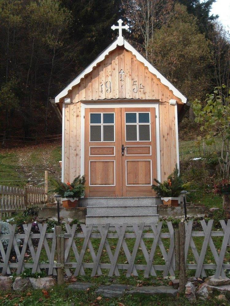 Die Gedenkkapelle am Laufnitzberg fügt sich äußerst schön in das Gefüge des Hofes ein. Sie wurde auf einem Betonsockel sehr geschmackvoll und zur Gänze aus hellem Holz erbaut. Das große Hofkreuz wurde damals vom Herrgottschnitzer Zenz in Adriach restauriert und hernach in die Kapelle integriert. Der Innenraum ist mit zahlreichen Heiligenbildern und Statuen, darunter eine prachtvolle Marienstatue mit dem Jesukind, ausgestattet. Drei Reihen gepolsterte Holzbänke laden dort zur Besinnung und zum Gedenken an die allzu früh Verstorbenen ein. Außerdem sind bei der Kapelle noch zwei Holztüren und drei Fenstern aus Holz vorhanden. Der Aufgang zur Kapelle führt über eine Stiege aus Granitplatten. Das Dach besteht aus den gleichen Eternitschindeln wie das Hausdach. Ferner sind beidseitig Dachrinnen angebracht. Das Seitenfenster und die Vorderseite der Kapelle sind mit Blumenkisterln zur Verschönerung versehen. Umgeben wird dieses Schmuckstück noch mit einem sehr schönen Holzzaun in Kreuzform.